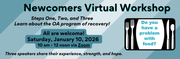 If you’ve been a member for two years or less, or consider yourself a newcomer, then this workshop is for you. Learn more about OA’s program of recovery from eating disorders. Get questions answered. Meet other members — including other newcomers.