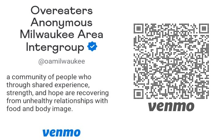 Donate from your smartphone by Venmo: to OVEREATERS ANONYMOUS MILWAUKEE AREA INTERGROUP, @oamilwaukee Note your 5-digit group number OR the day/time of your meeting. Also, split 60/30/10, 100% MAI, or scholarship. Check your settings to verify that your transactions are hidden to protect your anonymity. Consider setting up a recurring donation through Venmo.